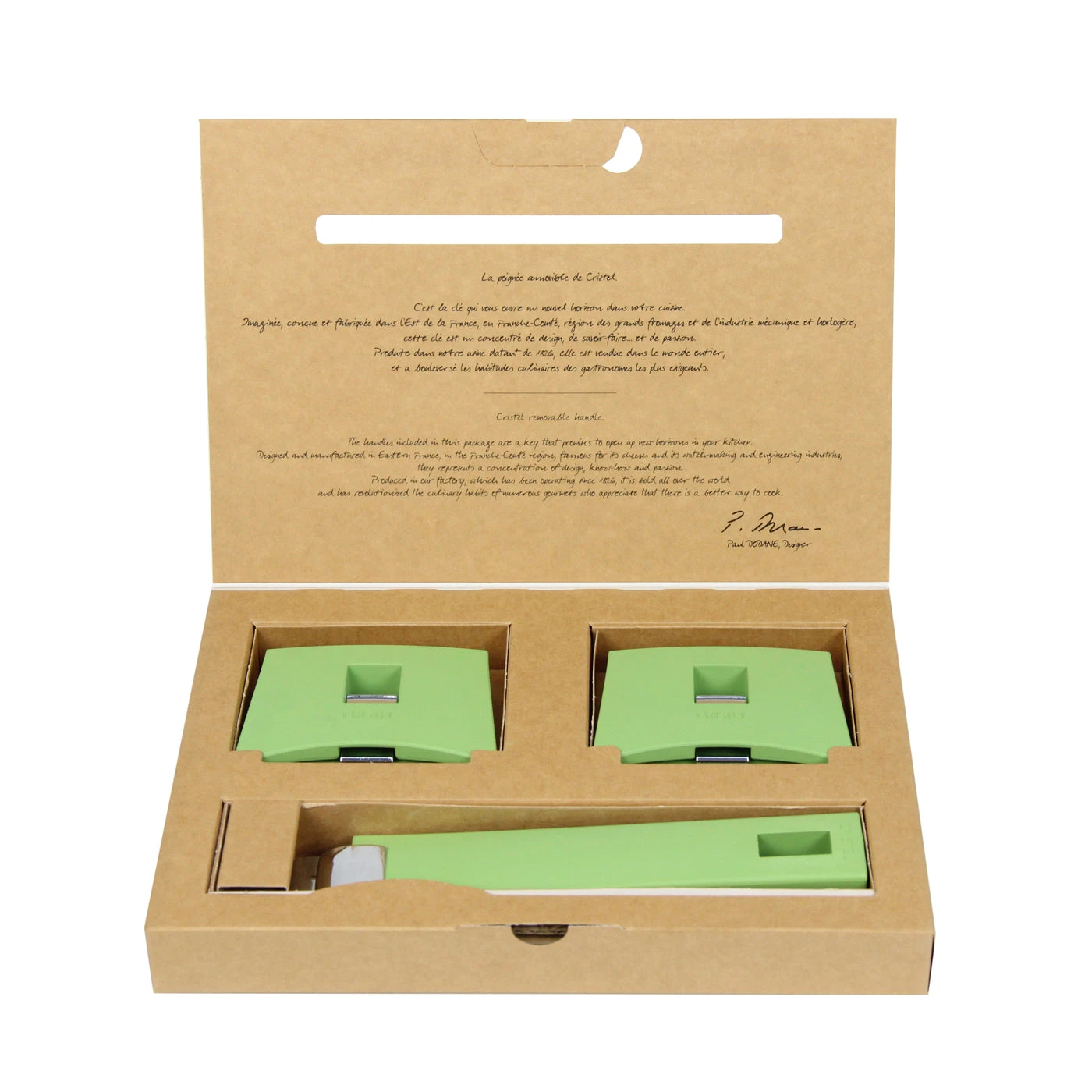 The latest of Cristel removable handles and grips (side handles), Mutine handles are primarily for stainless cookware from the Removable Mutine collection, but can also be used with all saucepans, frying pans, etc., or lids from Cristel removable collections. Made of Bakelite (does not melt) and with a stainless steel mechanism, Mutine removable handles and grips offer safe and modular use in the kitchen. Set of 1 Handle and 2 Grips (side handles). Color: Tillia – SPPLMAVT – 5 – A27