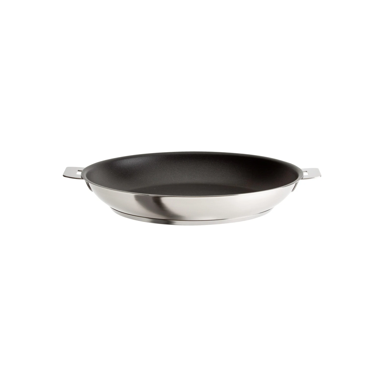 18/10 stainless frying pan with removable handle, brushed finish and Excalibur non-stick coating. Removable Strate collection. Stainless frying pans with a non-stick coating are ideal for browning and cooking fish, potatoes, eggs, etc. without sticking. For grilled meat, a stainless frying pan is the most suitable. For its frying pans, Cristel uses the Excalibur non-stick coating. Requires a removable handle. – P20QLE – 2 – W29