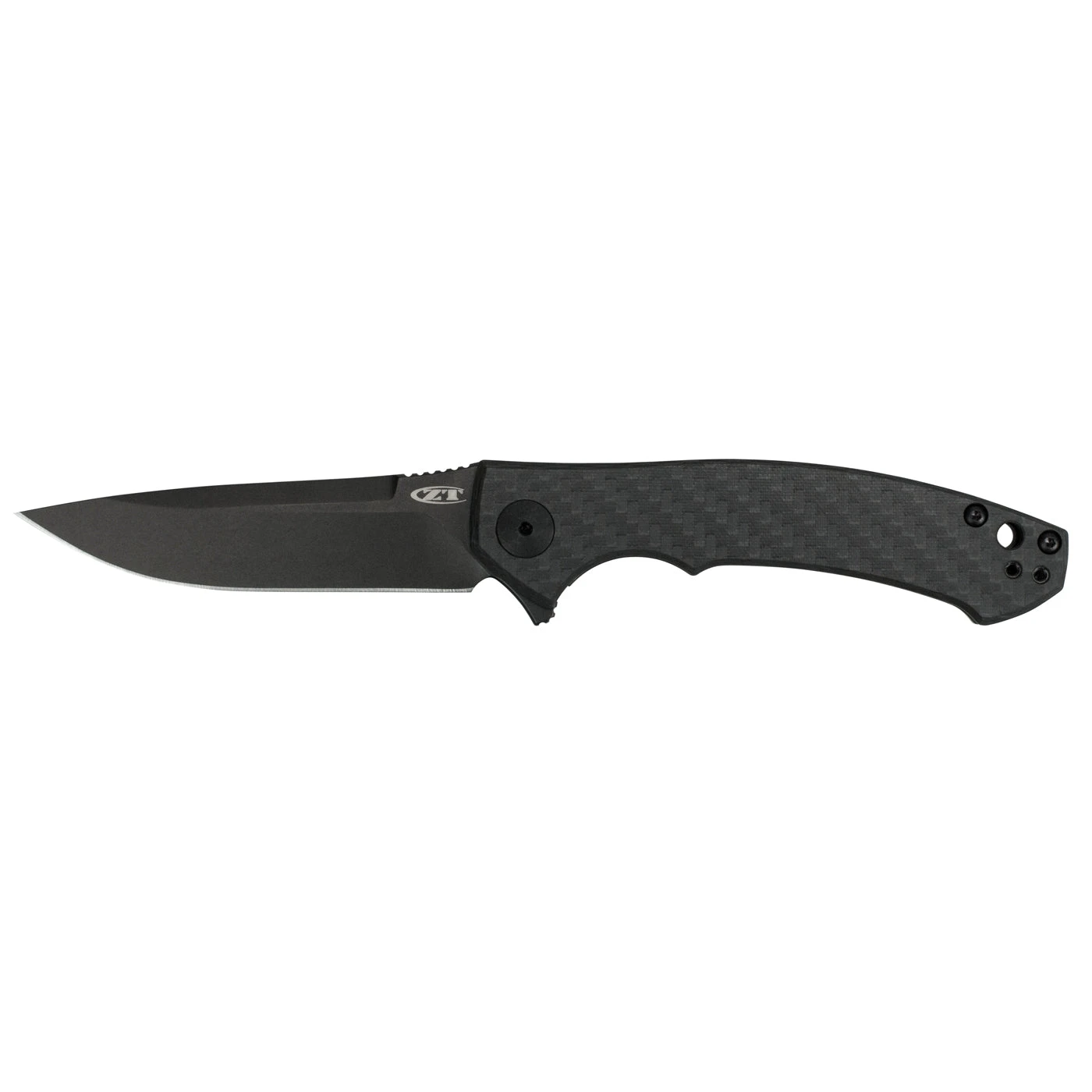 Zero Tolerance provides a dark, refined alternative to the original 0450 with the 0450CF. This sophisticated ZT is a smaller option in the ZT family, yet offers a robust combination of durable, premium-quality materials. The blade steel is S35VN for exceptional toughness, wear resistance, and edge retention. The S35VN blade is DLC coated for matte-black good looks and enhanced performance. The front handle scale is carbon fiber, balancing the knife’s solid construction with lightweight convenience. The DLC-coated titanium back handle offers a secure frame lock—so you can always cut with confidence. As an extra visual touch, ZT has added two emerald-green anodized-aluminum tube spacers that are especially eye-catching, standing out against the black handle. The 0450CF takes advantage of ZT’s KVT ball-bearing system to enable smooth, easy opening for either left- or right-handed users. A left/right reversible pocketclip rounds out the 0452CF’s basic feature set. While it’s a smaller, more gentlemanly knife, the 0450CF proudly lives up to the overbuilt standards for which ZT is well known.