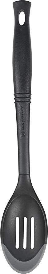This innovative slotted spoon features a unique bi-material head composed of both rigid nylon and flexible silicone. The nylon bowl provides strength, while the soft silicone lip is great for getting into pan corners. Le Creuset’s Bi-Material collection combines the sculpted lines, comfortable shapes and professional quality of their Revolution and Commercial lines with innovative heads featuring both glass-reinforced nylon and soft, food-grade silicone. Bi-material utensils are safe for use with nonstick cookware and clean up easily in the dishwasher. – 41032-000-444-00-5 – 5 – B87-1