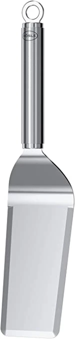 Elongated, narrow tapered spatula for turning and mixing meat, vegetables and fruit. Blade length is 15 cm/5.9 in., blade width is 7 cm/2.6 in. This spatula features rounded corners especially suitable for use on the Rösle Plancha grill. Features a round handle and hanging ring made from stainless steel. Dishwasher safe. – 25430 – 2 – B42-1