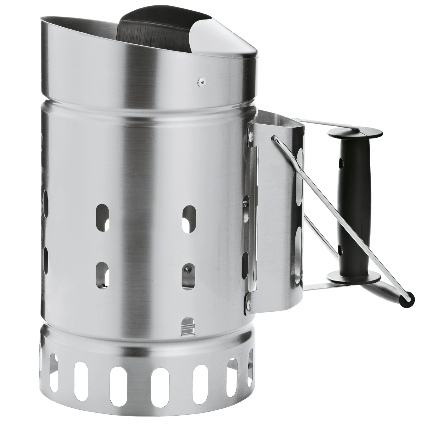 Convenient and quick lighting of charcoal and briquettes. Spark Guard for safe transfer of glowing coals into kettle grill. Large handle with heat shield provides a good and secure hold. Additional grip facilitates controlled pouring of hot coals. Fill capacity approx. 2 kg/4. 5 lbs (briquettes). – 25039 – 0 – A43-1