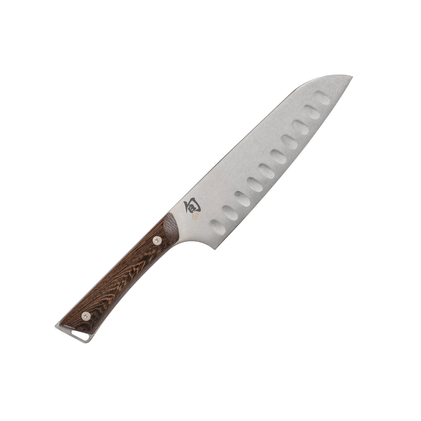 The Shun Kanso 7-in. Hollow-Ground Santoku is a beautiful, Asian-inspired chef’s knife that many cooks today have added to their kitchen favorites. A knife of many talents, a santoku easily handles all the basic kitchen cutting tasks. In fact, some people even prefer it to a chef’s knife. Slightly shorter than the standard chef’s knife, the Shun Kanso Santoku is very easy to maneuver—even in a smaller kitchen. There’s just enough belly curve to enable rocking cuts, which just adds to the knife’s versatility. We think you’ll find that this distinctive kitchen knife works beautifully and fits your hand like a glove. As easy to use as a chef’s knife, the santoku is especially well suited to a down-and-forward cutting motion (push cut). Many cooks swear by their santoku for easy food preparation and top performance. The Shun Kanso 7-in. Hollow-Ground Santoku is part of the Kanso series. Kanso is a design principle based on Zen philosophy. It means “simplicity,” but simplicity that is achieved by eliminating the non-essential. In Kanso, we took away anything that doesn’t matter and kept everything that does: high-performance steel, razor-sharp edge, perfect balance, and precision cutting control. The steel is Japanese AUS10A—highly refined, high-carbon, vanadium stainless steel that takes a razor-sharp edge and holds it longer. Kanso’s Heritage finish hides scratches and gives Kanso a rustic look that just improves with age. The handle is made of tagayasan wood, sometimes known as “iron sword wood.” The handle contouring enables an easy chef’s grip. Full-tang construction provides strength, balance, and easy cutting control. Like all Shun knives, Kanso is sharpened to a 16° cutting angle each side to cut cleanly and help preserve food’s freshness and best taste.