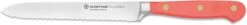 The perfect companion for preparing your packed lunch or at brunch: thanks to its fine serrated edge, this WÜSTHOF utility knife not only cuts cleanly through rolls without tearing, but it is also suitable for vegetables (such as firm tomatoes), fruit, or dry sausage. This makes it an integral part of sandwich preparation and of the brunch table setting, ideally found alongside our Cheese Knife. The Coral Peach handles are an energetic shade you can count on to give food prep a refreshing wake up. Confident and fun, this knife is ready to make every slicing and dicing moment a small celebration. – 1061708314 – 5 – B208
